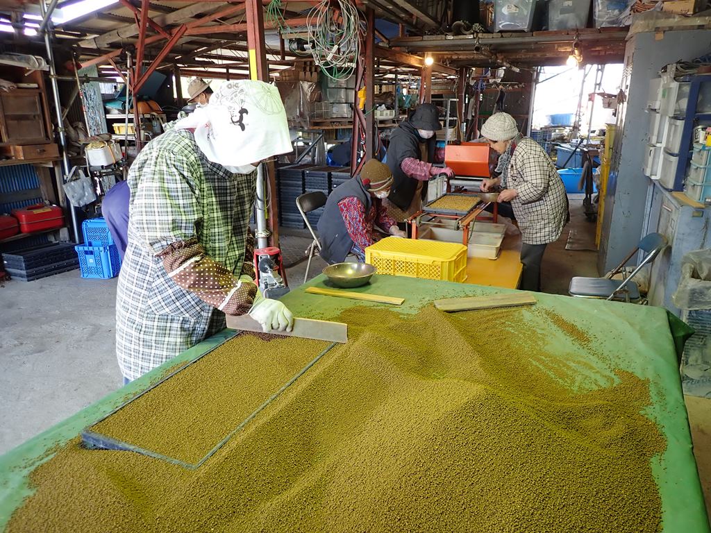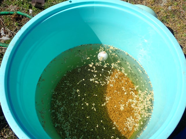 今は種子を購入していますが、ちょっと前までは自家採取した種子を、塩水選して充実した種子を選別していました。塩(食塩:NaClか硫安肥料:NH4SO4)を生卵が浮く位の濃度(比重1.13)に溶かして、籾を投入撹拌し、沈んだ種子を種もみとして使いました。昔の人の知恵です。自家用に一部塩水選をしたりします。塩水選した籾や購入種子は播種10-14日ほど前に浸種します(10℃以下の井戸水に)。種まきの2日前になりましたら、水温を上げて促芽処理(28℃に一晩)をします。